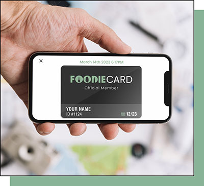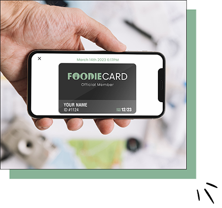 Any Restrictions? Foodie Card can be applied to participating restaurants for dine-in and pickup. For dine-in, Foodie Card is applied to the entire bill, drinks included. Participating restaurants reserve the right to refuse Foodie Card on the following holidays: Christmas Eve, Easter, Father’s Day, Mother’s Day, New Year’s Eve, Thanksgiving Eve, Cinco de Mayo, Valentine’s Day. There’s a maximum discount of $100 per bill. Foodie Card cannot be combined with any other coupons, specials or discounts.